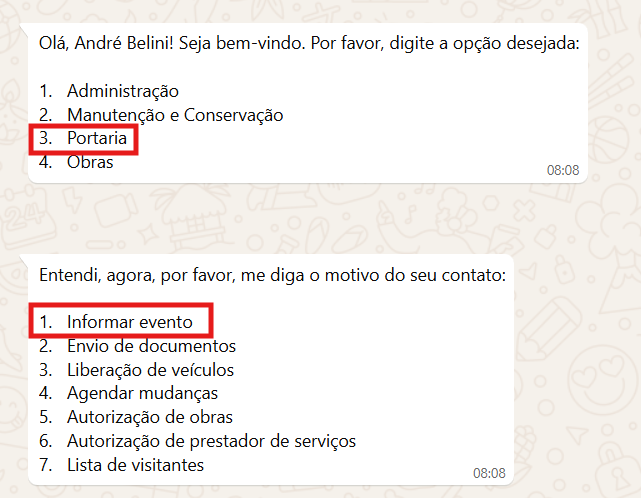 Para acionar a portaria, sempre use o SAC, através das opções: